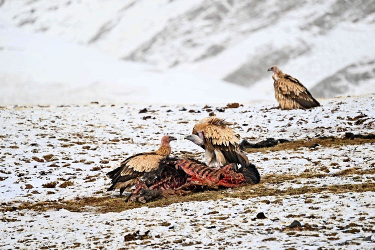 2023年5月1日,青海玉树州曲麻莱县,高原兀鹫在雪地觅食。宋林继 摄
