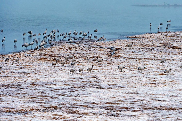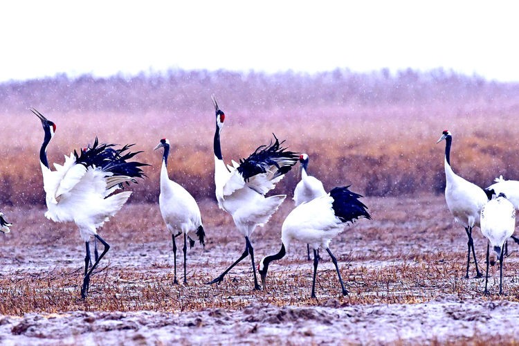 2016年1月13日,云南昭通大山包自然保护区,气温骤降,冰天雪地,翅膀上挂满冰雪的黑颈鹤聚集。宋林继 摄