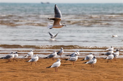 2024年3月26日,山东西海岸新区前海海滨,迁徙路过这里的海鸥成群结队,它们有的在海滩上嬉戏、觅食,为春天绮丽的海滨带来了无限生机与活力。韩加君 摄