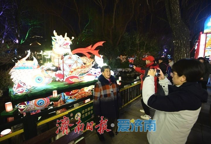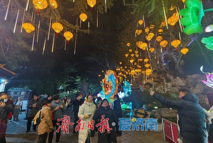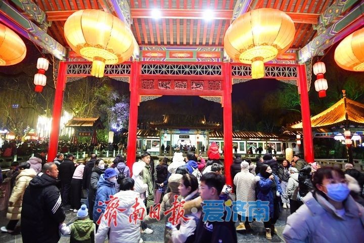 1月29日晚,市民和游客在济南趵突泉景区内欣赏第44届天下第一泉迎春花灯会。当晚,第44届天下第一泉迎春花灯会趵突泉景区花灯正式亮灯,将至2025年2月27日(正月三十),展期一个月。