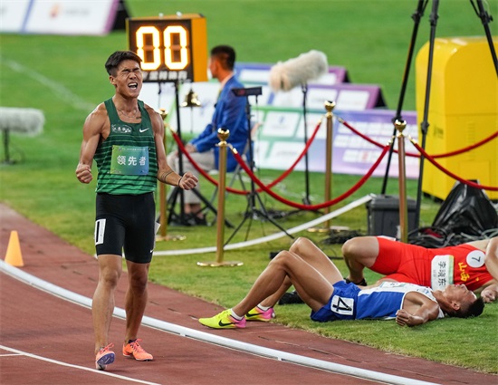 9月21日,江苏队选手孙启豪(左)在十项全能1500米比赛后庆祝。