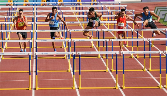 9月21日,江苏队选手孙启豪(左三)和浙江队选手华梓惠(左一)在十项全能110米栏比赛中。