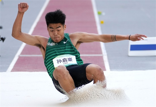 江苏队选手孙启豪在跳远比赛中(9月20日摄)。