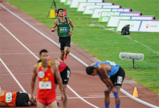 9月21日,江苏队选手孙启豪(后)在十项全能1500米比赛中。