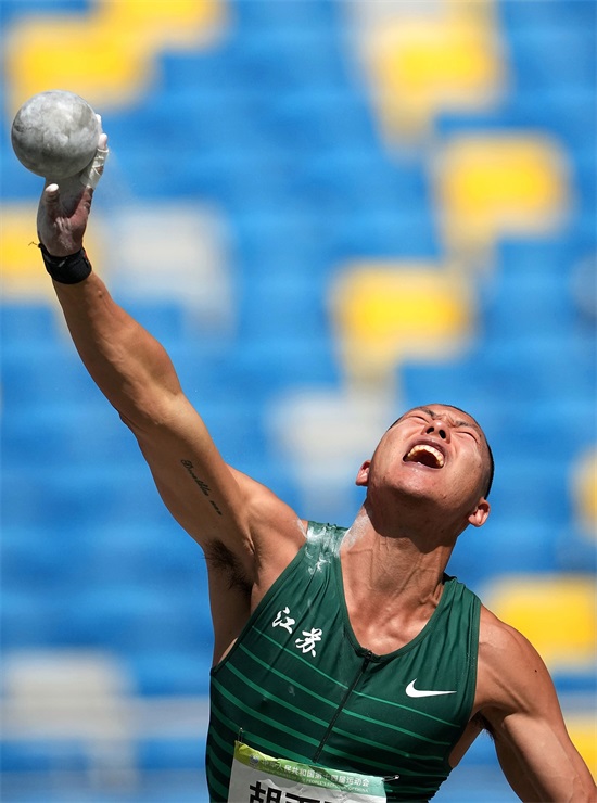 江苏队选手胡雨飞在铅球比赛中(9月20日摄)。