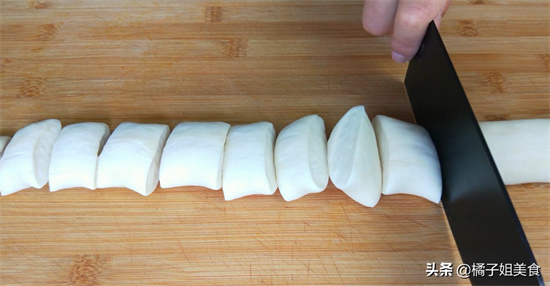 3、面团饧好之后把它再揉至光滑,然后把它搓成长条,再下均匀的剂子,这个剂子的大小是25克。