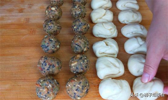 5、把面剂子擀大擀薄,上面抹上一层油酥,然后卷起来对折,再次把它擀大擀薄,抹上油酥,卷起来之后再对折,做成一个个有层次的剂子,馅料也分成25克一个,整理成一个个小圆球