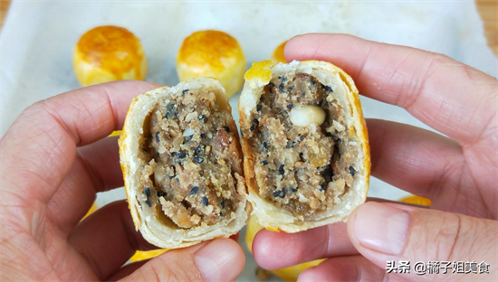 9、掰开一个看一下,里面的馅料有着几种材料丰富的香味,真的很香很好吃,不管是自己吃还是拿来送人,都是非常的受欢迎,如果你喜欢也试试做吧。