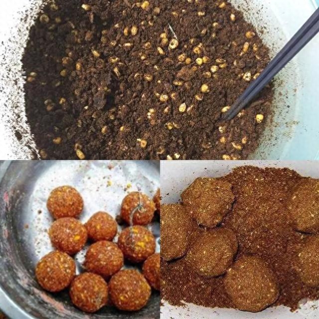 2、适量菜籽饼用手捏碎,然后加入酒米、商品饵 (比例2:1:1)两勺红糖粉或白糖均可,少量曲酒,混合均匀后密封三五天就可以使用了。
