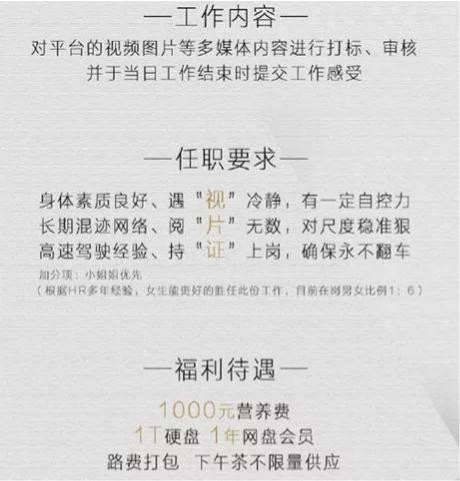 她万万没有想到,这“带薪看片”居然能这么赚钱,在利益的驱使下,她又仔细读了一遍“岗位要求”
