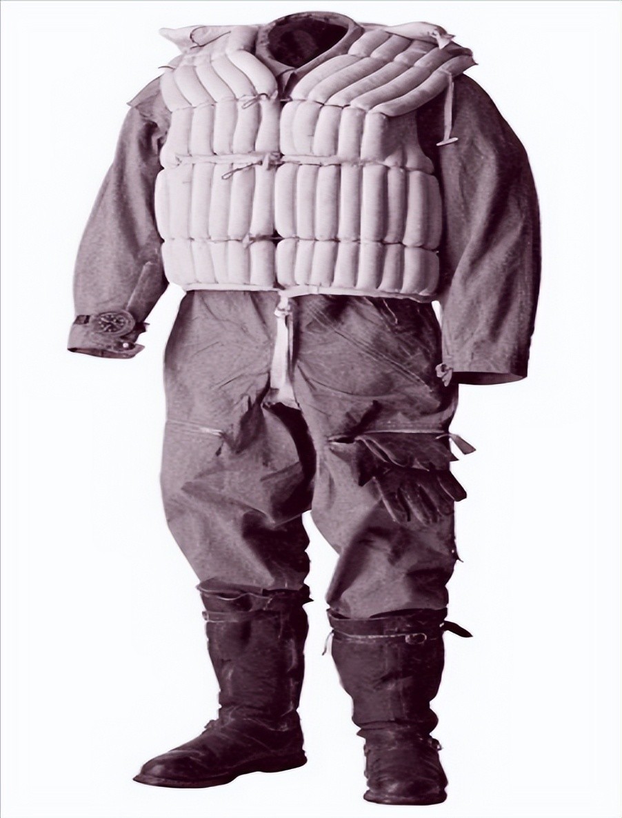 1940年,德国的轰炸机机组人员就身穿这种轻便的夏季飞行服和有羊毛衬里的皮靴。外面套着肥大的丝棉救生衣。