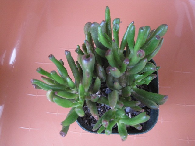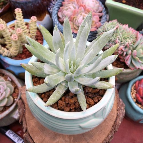 叶片呈灰绿色,叶面上有一层淡蓝色的霜粉,在阳光充足,有一定温差的环境下会变成粉红色。少见的可水培多肉。
