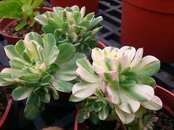 叶片较薄,匙形,中间含有黄色的锦斑。锦斑可能会消失,也可能完全锦斑化(全黄色),决定因素非常多,不可控。