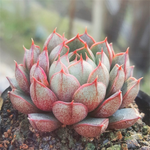 植株小型,叶片较厚,卵形,带小尖,无茎的莲座叶盘非常紧凑。叶片蓝绿色上面有浓厚的白粉,叶缘为美丽的深粉红色。