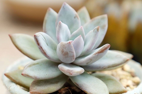 叶片呈扁梭形或卵形,向内弯曲,有叶尖,叶缘圆弧状,叶背有棱线。叶片光滑,表面覆盖微量白粉,排列成莲座状。颜色为灰绿色,表面覆盖的天然霜粉使其增添了些许灰蓝色的淡雅色调,阳光晒后叶尖变为红色。