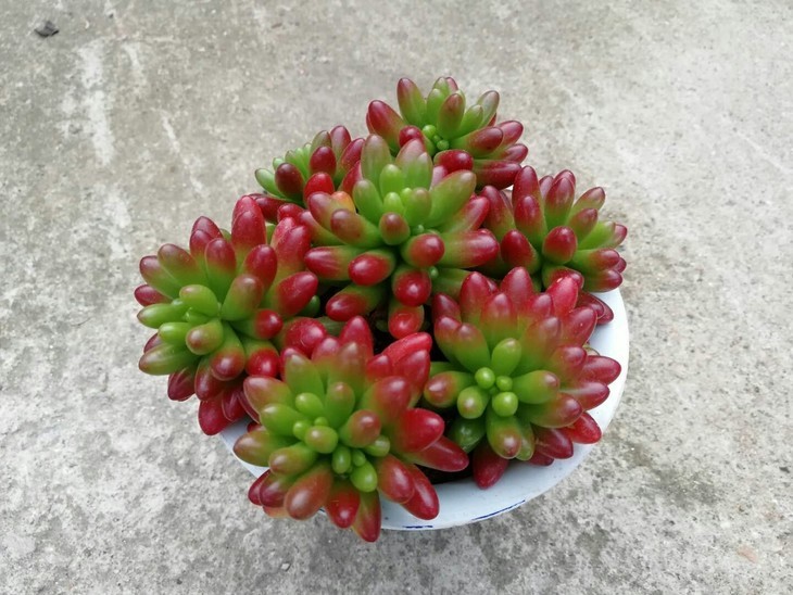 叶棒状蓝灰色,密集生长在茎端,表面覆有白蜡粉,冬季叶色濡染紫红色调,喜欢阳光充足的环境,全日照下可以保持叶形的紧凑,叶片也会慢慢转为蓝粉色。茎匍匐生长,接触地面容易生长不定根。