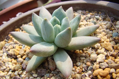 叶片稍薄为灰蓝色(温差大、日照时间长的环境下叶片会变为淡粉色),叶前端稍尖,叶片表面有一层白霜,日常浇水时需注意勿将白霜冲刷掉。