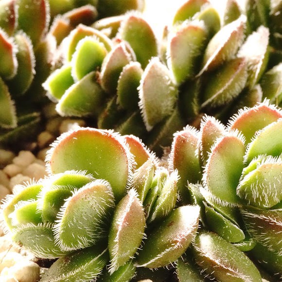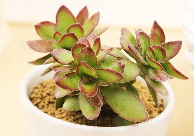 叶片比锦晃星要小且长,叶面有绒毛容易积水,排列松散。叶色常年嫩绿,昼夜温差大或冬季低温期叶缘会变成红色,弱光状态叶色浅嫩绿,容易拉长。