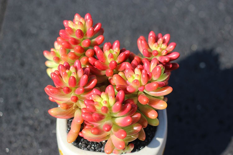 株形和石莲花属极为相似,叶色朱红带褐色,叶片呈瓜子型,上有白粉,叶末较尖有须,开黄色小花,星状。