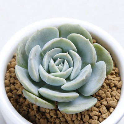 叶片厚实,呈翠绿色或嫩绿色(在光照充足、温差大的环境下,叶尖会出现小红点),叶匙形,互生,表面光洁,正面平坦,背面微微隆起,呈莲座状排列,叶面上被白粉。
