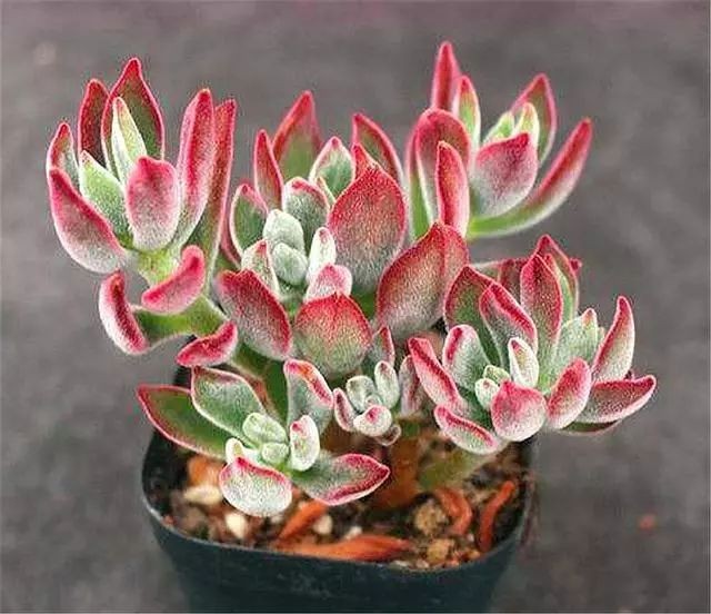 叶片肥厚,灰绿色卵状,叶端及上缘呈红色,上面布满了细短的白色绒毛。