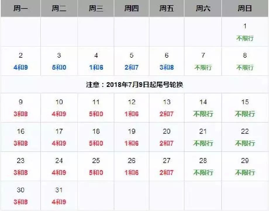 2018年7月9日以后,禁行号码与北京市同步轮换;车牌尾号为英文字母的以最后一位阿拉伯数字为准,限行包括临时车牌和外地车牌。