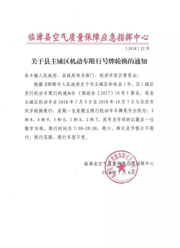 根据我县空气质量保障应急指挥中心《关于县主城区机动车限行号码轮换的通知》(〔2018〕22号)要求,2018年7月9日起,对主城区机动车限行尾号调整: