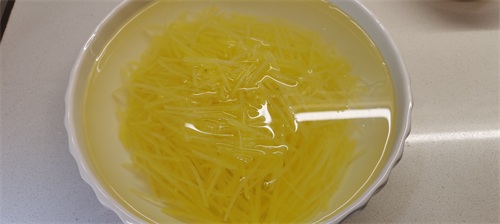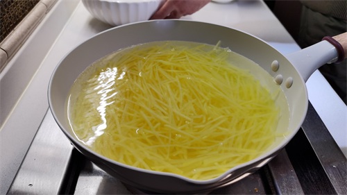 2、热锅烧水放入土豆丝焯一下,过凉水