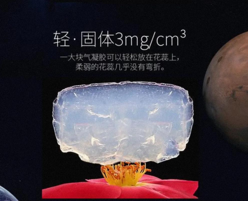 虽然气凝胶是固体,但在它的成分中,有99.8%都是空气,因此气凝胶是世界上密度最小的固体,即使把一块气凝胶放到一朵花上,花都不会被压折,别看它这么轻,但它的强度却十分惊人的,就算是你用超过它本身500到4000倍重量的物体来跟它硬碰硬,它都完全承受得住。