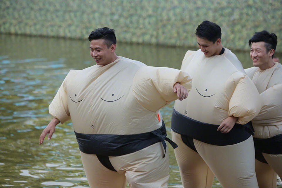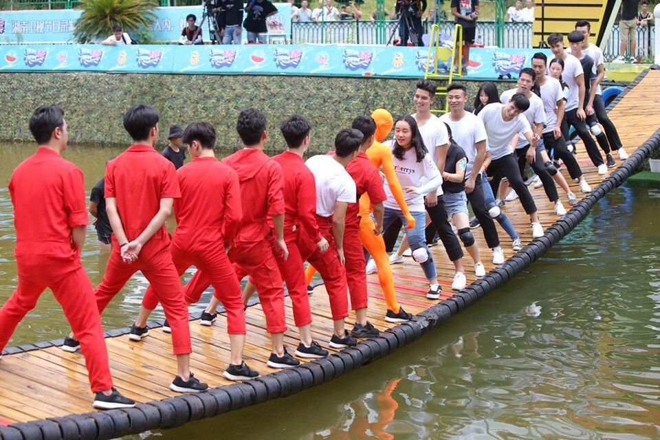 如果说抽中了“恐龙队”的唐思楠“压力山大”,那么抽中了“绵羊队”的张松武也并没有松一口气。看着“绵羊们”整齐划一的摇桥姿势,我们就知道这场比赛依旧是一场难打的仗。没摇两下,后排的两名成员就跳入水中,听见落水声回头的张松武看着水池中的队员一脸茫然。比赛继续,由于害怕选手再次落水,张松武频频回头,小心翼翼地观察着自己队员们的摇桥状态。回头也无法改变结局,“绵羊队”火力全开,几下就将参赛选手全部摇入水中,端着水盆的小橘化身“容嬷嬷”,将张松武的惩罚双手“奉上”。