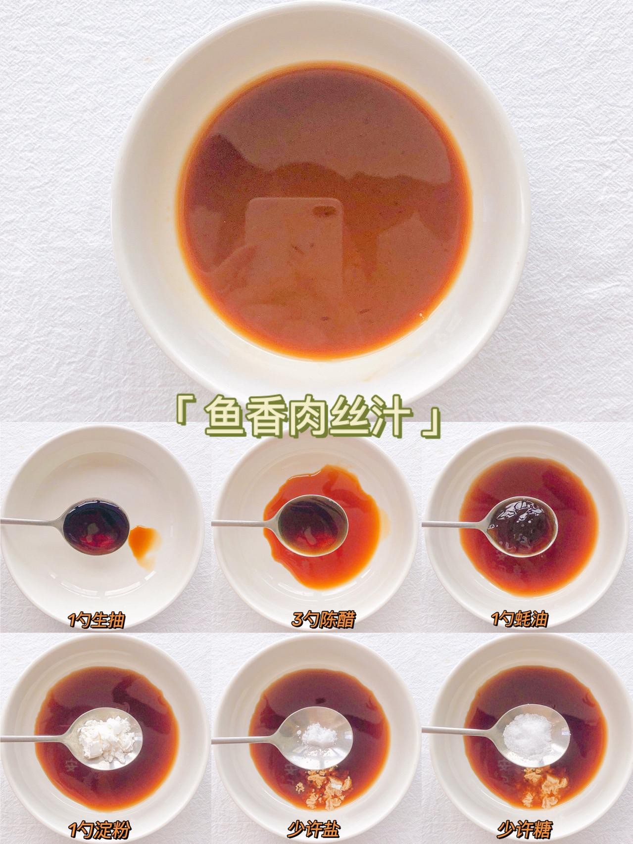 用料:1勺生抽+3勺陈醋+1勺蚝油+1勺淀粉+少许盐+少许糖+1勺豆瓣酱适用:鱼香肉丝、鸡蛋鱼香肉丝、荷包蛋焖面