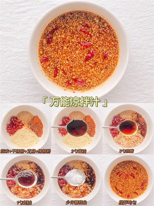 用料:2片蒜末+3g辣椒粉+半勺白芝麻+2个干辣椒+2勺酱油+3勺陈醋+1勺蚝油+少许糖和盐适用:凉拌包菜、凉拌海带丝、凉拌鸡胸肉丝、凉拌拍黄瓜、大拌菜