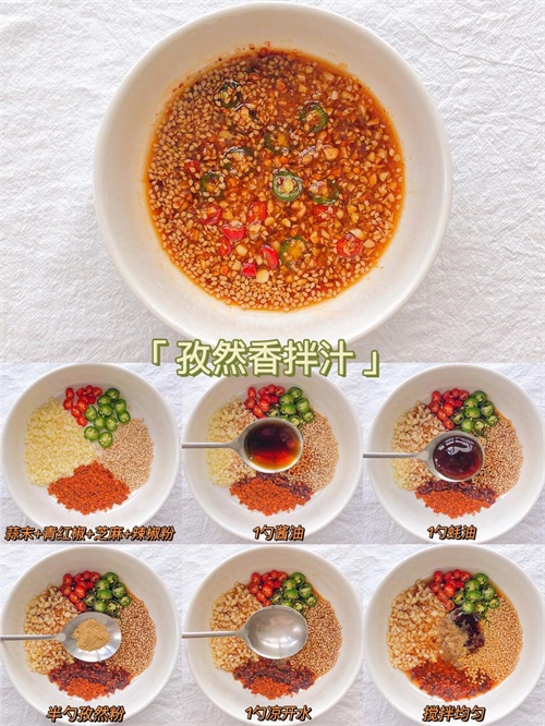用料:2片蒜末+青红椒+芝麻+辣椒粉+1勺酱油+1勺蚝油+半勺孜然粉+1勺凉开水适用:香菜拌牛肉、烧烤汁、烤冷面、大拌菜