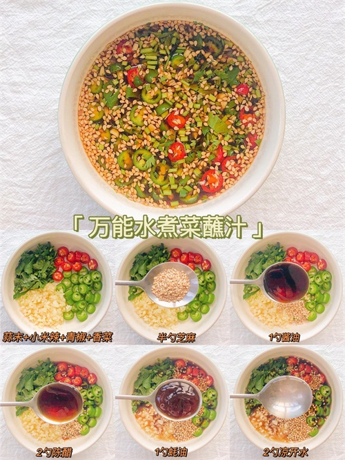 用料:2片蒜末+小米辣+青椒+香菜+半勺白芝麻+1勺酱油+2勺陈醋+1勺蚝油+2勺凉开水适用:水煮菜、大拌菜、凉拌菜、低脂捞汁