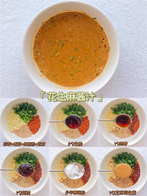 用料:蒜末+香菜+辣椒粉+芝麻+2勺生抽+1勺陈醋+1勺蚝油+少许糖和盐+1勺芝麻花生酱+1勺凉开水适用:水煮菜、麻辣烫、火锅