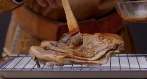 4、烤20分钟,取出羊排,把调好的蘸料,均匀刷在羊排表面。