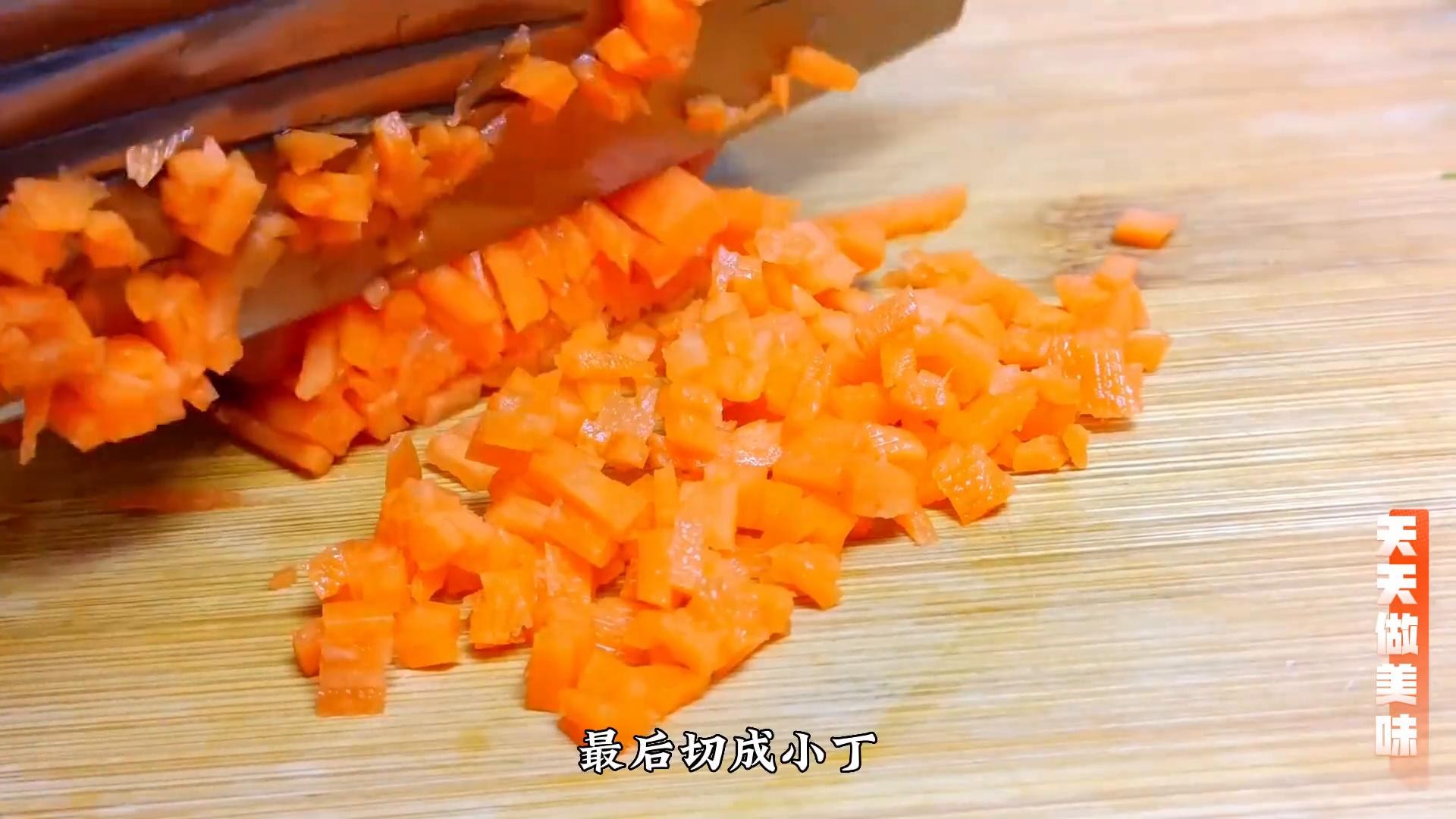 ·下面准备一根胡萝卜,先切成厚厚的薄片,再改刀切成细丝,最后切成小丁,切好以后直接放入面糊里。