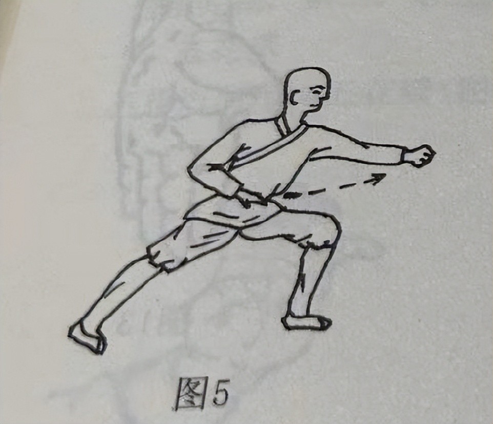 1.标拳(直拳、冲拳)。过程从拳心向上螺旋到拳面向前、拳心向下(图5)。攻胸、腹。