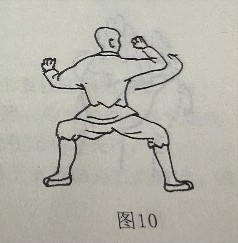 6.飞拳。拳心向内或向下,胸前向上飞击(图10)。攻头、下颌。