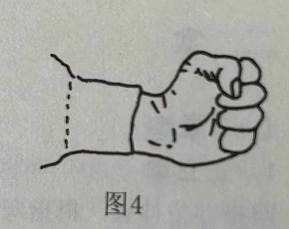 3.瓦楞拳,四指弯曲内扣,大拇指封盖在食指空眼处(图4)。砸、撩、劈。