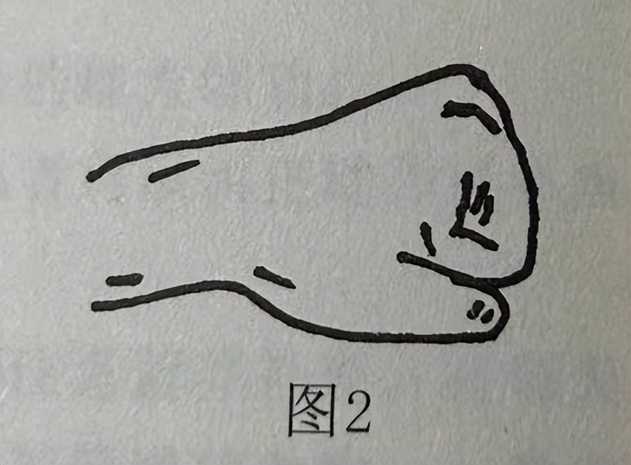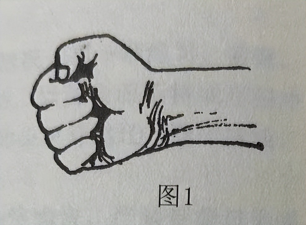 1.四平拳,四指并拢弯曲,紧握于掌心,大拇指扣在食指、中指的第二指骨上,手腕绷紧,拳背平,拳面直(图2)。直、摆、勾。