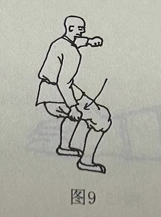 5.劈拳。拳眼向上,拳心向内,由前上方向外或向后下方劈砸(图9)。攻大腿、身后者。