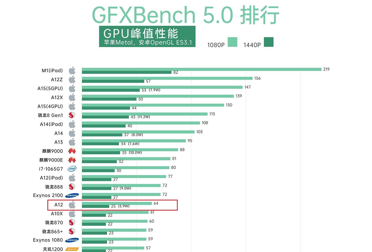 GPU部分,参考GFXBench 5.0 Aztec Ruins的成绩,1080P和1440P分辨率下,A12分别是64帧和25帧,和A12得分比较接近的是骁龙870和骁龙888,骁龙870分别是60帧和22帧,落后A12大约7%,骁龙888分别是72帧和27帧,领先A12大约12.5%,因此就GPU性能而言,A12介于骁龙870和骁龙888之前。