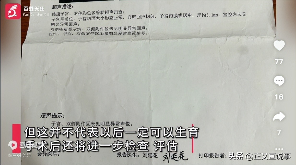 医生说,经过初步检查,她的子宫、卵巢发育正常。但以后能不能生育,还得手术后进一步评估。