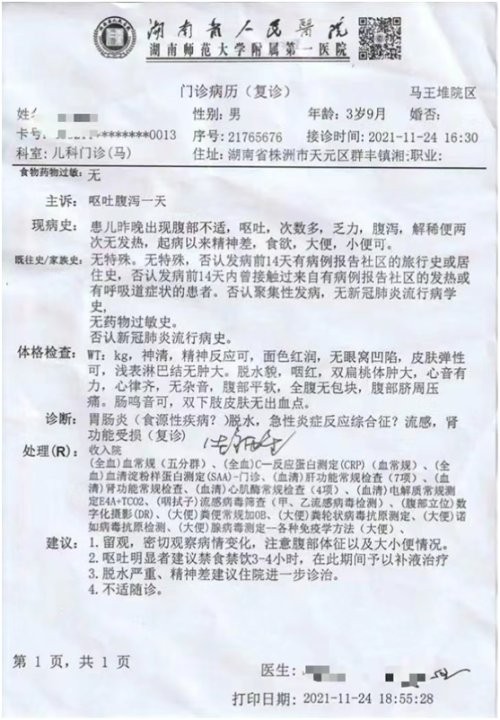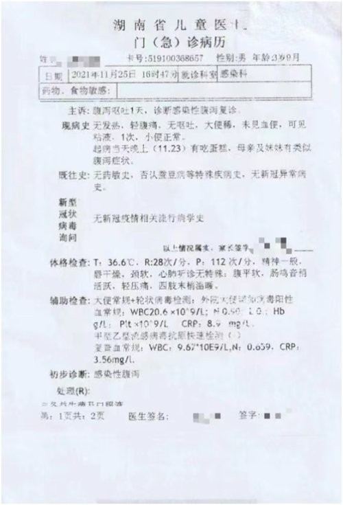 “儿子吃得多,当晚就开始频繁呕吐、哭闹,第二天呕吐腹泻,说肚子痛;女儿只吃了几口,第二天哭闹腹泻几次;我也吃了一块,第二天也腹泻了三次。”王女士告诉记者。11月24日,王女士送孩子先后前往湖南省人民医院和湖南省儿童医院进行检查,湖南省儿童医院初步诊断为感染性腹泻。
