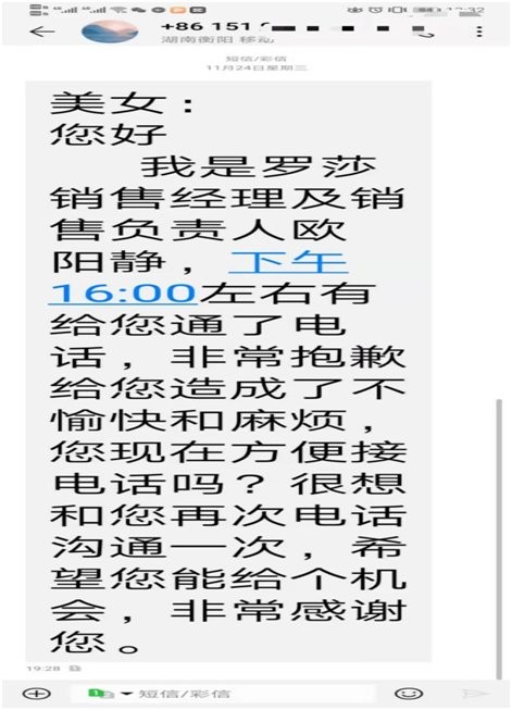 12月1日上午,记者联系了罗莎销售经理欧阳静,她表示,关于王女士的投诉她需要先了解一下,随后又改口称“没有这个事情”,便挂断电话。目前长沙市天心区先锋市场监督管理所已介入调查此事,二三里资讯也将持续关注。