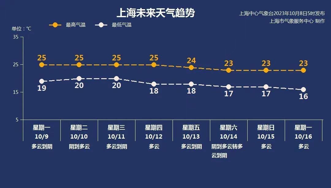 天气预报显示,下周工作日天气形势调整不大,申城以多云或阴的天气为主,气温略有起伏,最低在17至20℃之间,最高气温在23至25℃之间,提醒大家携带雨具,同时适当增加衣物,谨防感冒。据悉,上海常年的入秋时间是10月5日。这波降温过后,能否一脚踏入气象意义上的秋天,最主要看9日的气温情况,即需要当申城连续5日的日平均气温都低于22℃时,才能代表申城已经进入秋季。