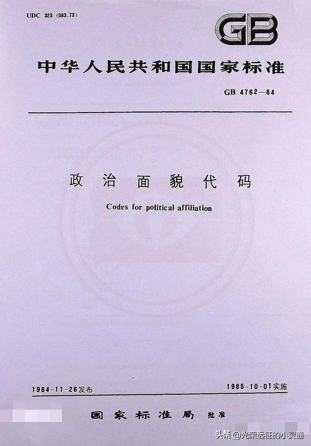 《政治面貌代码》是1985年10月1日实施的一项中国国家标准。中华人民共和国国家标准局发布了“政治面貌代码“(英文Codes for political affiliation ),以适用于使用信息处理系统进行人事档案管理、社会调查、公安户籍管理等方面工作时信息处理之间的信息交换。
