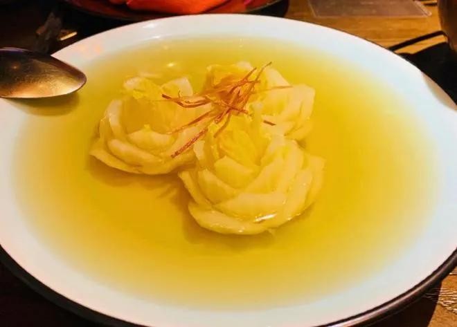 最终成品的开水白菜,清汤寡水,油星全无,但闻起来却香味扑鼻,吃在口中清鲜柔美,自胜过那万般佳肴。这道菜看似朴实无华,实则尽显制汤功夫。汤醇淡素雅,清澈见底;白菜色泽嫩绿,形态艳丽,见之顿觉清鲜明快。轻尝一口,白菜的清甜与高汤的鲜美交织在一起,层次丰富,令人回味无穷。