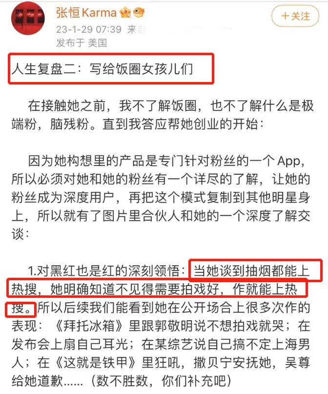 1月29日,张恒再度发长文公开锤郑爽,不仅晒出了郑爽与合伙人的聊天记录,还爆料了很多pua粉丝的手段,再度刷新大众的三观。